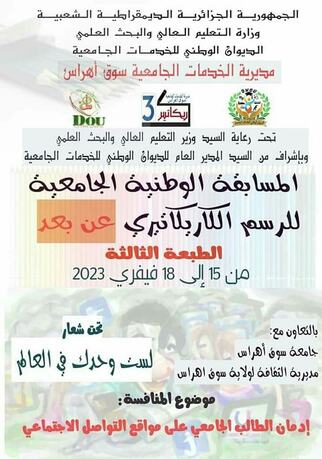 كما يسعدنا أن نضع بين أيديكم هذا الموقع والخاص بمديرية الخدمات الجامعية سوق اهراس ، أين نحاول من خلاله تقديم أجوبة لمختلف التساؤلات التي يطرحها كل طالب و الذي نأمل ان يكون منبرا لتزويدكم بمختلف المعلومات المتعلقة بالخدمات الجامعية و طريقا للتواصل و الرد على جميع استفساراتكم،كما نأمل مستقبلا أن يصبح هذا الموقع وسيلة لتسهيل الخدمات اليومية المقدمة لكم من إعادة تجديد ملف الإيواء و المنحة و النقل والمشاركة في النشاطات و المسابقات التي تنظمها المديرية والاطلاع على جميع القوانين واللوائح التي تخص الحياة الإجتماعية للطالب داخل الإقامات الجامعية.و إثراء لمحتوى الموقع ندعوكم للمساهمة بكل فاعلية في تحسين الخدمات المقدمة وذلك لا يأتى إلا بتقديم ملاحظاتكم واقتراحاتكم وفتح باب التواصل المباشر معكم سعيا منا على تقديم أفضل الخدمات لجميع الطلبة والطالبات.